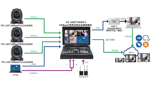 当决定了会议举行地点之后,只需要将HS-1600T MARK II携带至会场内,将PTC-140T摄像机置于合适的位置,并将其通过一根六类网线连接至HS-1600T MARK II上。您的便捷直播系统主体就搭建完成了,且室内室外都适用。