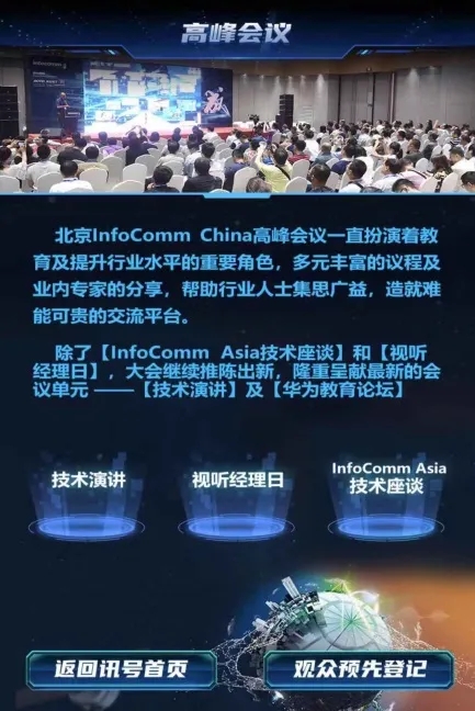 当然,北京InfoComm China展会每年都少不了业内人士万般期待的北京InfoComm China高峰会议。大会本次特邀了诸多科技企业巨头,包括腾讯、阿里云和华为等大咖,首次齐聚共襄盛举,为与会代表提供了多场免费的学习机会,在提升专业知识的同时,掌握市场发展脉动,为未来数字大时代做好最完善的准备!