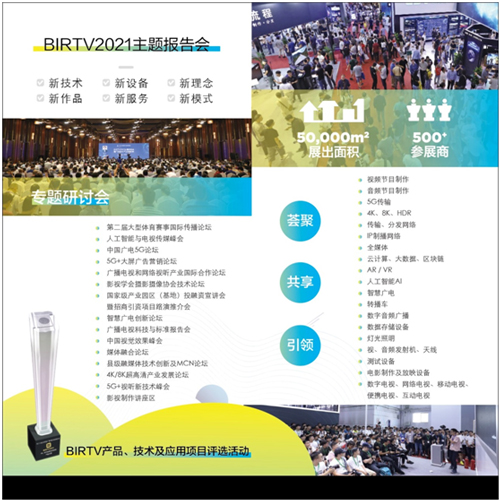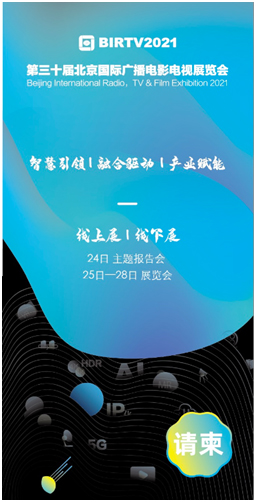 由国家广播电视总局、中央广播电视总台指导,中国广播电视国际经济技术合作总公司承办的第三十届北京国际广播电影电视展览会(BIRTV2021)定于2021年8月25—28日在北京中国国际展览中心(静安庄馆)举办。主题报告会暨广播电视和网络视听发展峰会于8月24日在北京国际饭店会议中心举行。