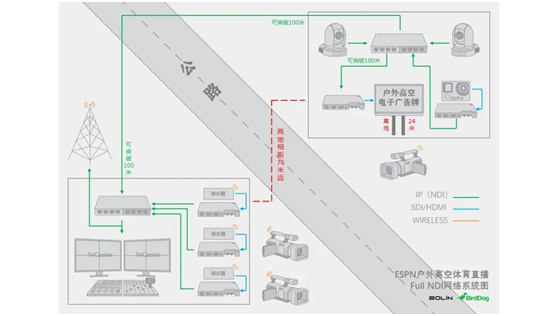 基于Full NDI的网络方案,完全支持在24米高空搭建一个露天直播室,并与公路对面相距77米远的制作室连通。