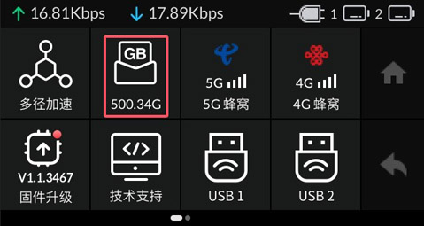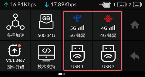 查看「5G蜂窝」、「4G蜂窝」、「USB1」和「USB2」图标,亮起状态表示信号正常,如下图所示。