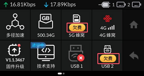 若在图标上出现欠费提示,表示对应的内置SIM卡和USB移动网卡内SIM卡欠费,需充值SIM卡保证流量正常使用。