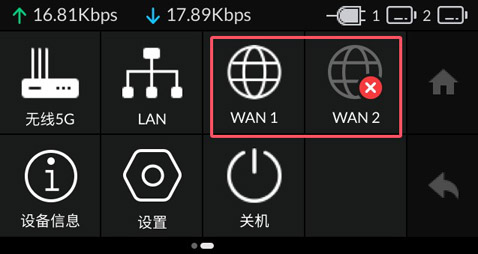 向左滑动设备小屏幕,查看「WAN1」和「WAN2」图标,亮起状态表示信号正常,若是带叉符号表示网络异常,需检查接入的有线网络是否正常。