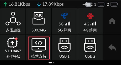 2、然后直接点击设备小屏幕上「技术支持」图标→确定「开启技术支持」,这样美乐威技术支持即可远程查看设备状态,5分钟内定位问题并给出解决方案,实现最佳聚合网络。