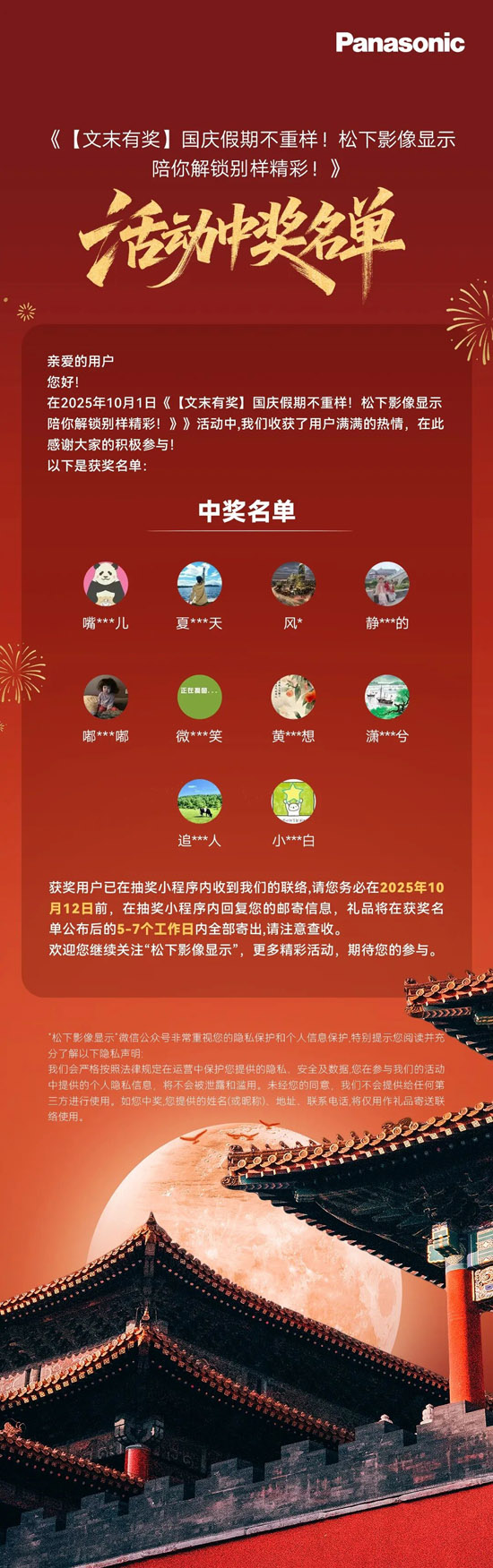 · 《【文末有奖】国庆假期不重样!松下影像显示陪你解锁别样精彩!》活动中奖名单