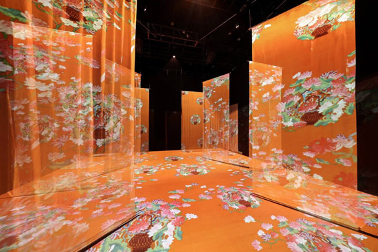 展厅布置了层层丝绸缎带,10台巴可I600-4K15将光影精准地投射在不同介质上,演绎“衣冠上国”的华彩。观者漫步其间可触发鲜花绽放、蝴蝶与仙鹤伴飞的景象,解构织锦文物的经纬之美。