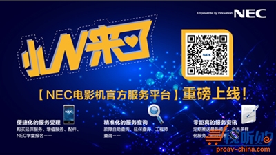 除了及时、快速响应消费者的需求外,NEC更随时根据用户需求提升和改进服务。如2015年,NEC结合当下移动互联网发展趋势及用户的触媒习惯,率先上线运营“NEC电影机官方服务平台”,成为业内首家打造以功能性为主的电影机微信服务号运营厂商;用户只要关注“NEC电影机官方服务平台”微信公众号就能指尖一键申请增值服务,自助查询故障,了解最新资讯等。