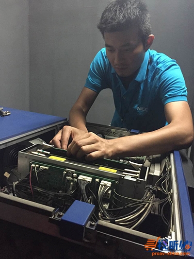 引擎清洁时,必须要用无脱落软毛刷和吸尘器除去表面积尘,并且这个过程禁止使用任何吹风设备。而部分型号的放映机更特殊,如NC900C、NC1100L,在清洁引擎时,要对PRISM棱镜缝隙镜面进行清洁。过程中每一步工程师都得屏气凝神,极为专注!瞧,我们的工程师多么认真!