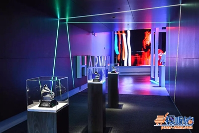 走廊上灯光与音乐交相呼应,装有一块超大18'x 10'的三星LED视频墙,摆放着近年来哈曼专业旗下各品牌所获得的格莱美技术奖杯。
