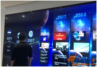另一种是通过人体移动及动作指示实现与拼接墙上内容的互动,例如在展示页面时间轴上挥一挥手就可以打开当年公司的大事记。