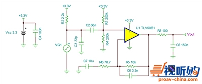让我们来看一个电路的示例设计,用于+ 3.3V电源,输入为7.93mVRMS,输出信号为1VRMS。7.93mVRMS对应于具有麦克风的0.63Pa声级输入和-38dB声压级(SPL)灵敏度规格。带宽目标是将300Hz的常见语音频率带宽传递到3kHz。