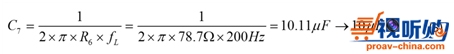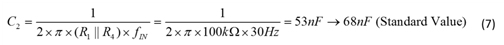 要将输入信号截止频率设置得足够低以使低频声波仍能通过,请选择C2以实现30Hz截止频率(fIN)(公式7):