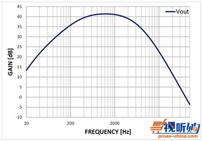 图2显示了麦克风前置放大器电路的测量传递函数。由于高通滤波器和低通滤波器之间的窄带宽和衰减,平带增益仅达到41.8dB或122.5V / V,略低于目标。