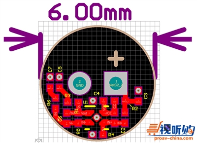 采用TI的X2SON封装技术将电路安装到6mm直径驻极体麦克风的背面。由于安装尺寸限制,需要采用非常小的运算放大器:TLV9061的占位面积仅0.8mm×0.8mm。此外,0201小尺寸电阻和电容最大限度地减小印刷电路板(PCB)面积,您也可以采用更小的电阻来进一步减小该面积。印刷电路板布局如图3和图4所示。