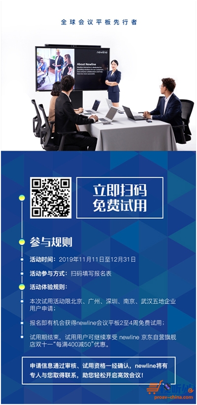 2019年11月11日至2019年12月31日,newline在北京、广州、深圳、南京、武汉启动会议平板免费试用活动,企业用户访问newline官方微信公众号平台进行报名,即可申请65”会议平板试用机会,近距离体验智能会议之美!