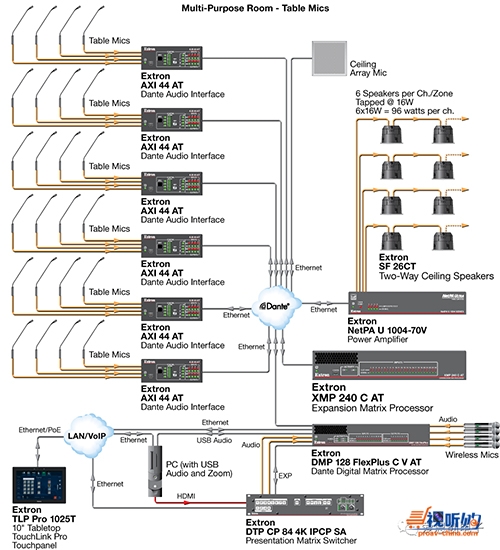 在以上多功能会议室系统中,DMP 128 FlexPlus C V AT和XMP 240负责音频的路由及处理,而视音频矩阵切换则由DTP CrossPoint来完成。来自天花板及桌面安装的共计32个麦克风通道均可通过Dante与系统连接,从而实现会议所要求的各类音频处理,其中包括32个通道的AEC。Extron TLP Pro 1025T触摸屏可通过网络对整个系统进行控制。通过XPA U 1004-70V这一4通道、半机架宽的功率放大器实现高性能混音消除后的音频信号,可直接被输出至SF 26CT双路天花板扬声器。