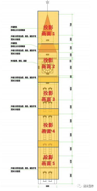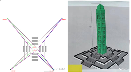 以新世纪广场钟楼为载体,设计四面投影的3D画面,立体呈现诗经故里、鹤舞樱飞、建党100周年的画面,对鹤壁市的发展成果进行循环展示,宣传鹤壁,烘托节日氛围。”
