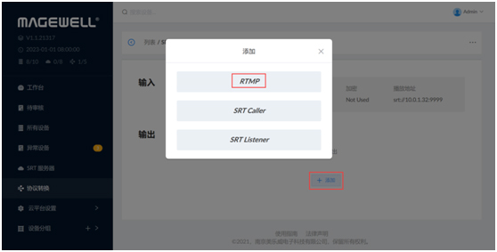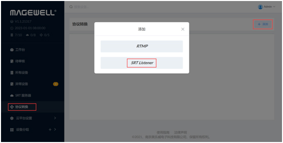 1、进入“协议转换”页签,点击“添加”,在弹出的页面中选择“SRT Listener”。