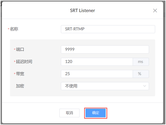 在弹出的页面中填写名称(如图中的“SRT-RTMP”)和端口(如图中的9999),点击“确定”。