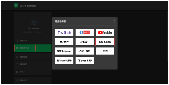 2、同上,登录编码盒Web GUI,进入“直播服务器”页签,选择 “SRT Caller”。