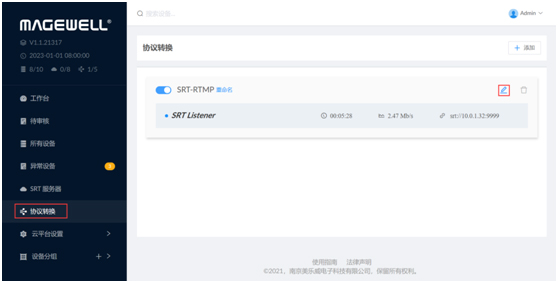 3、返回Magewell Cloud的“协议转换”页签,此时可以看到Magewell Cloud已经接收到编码盒发送的SRT流。点击铅笔小图标,进入设置页面。