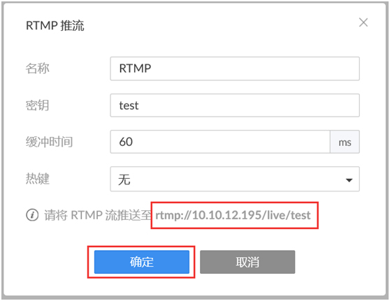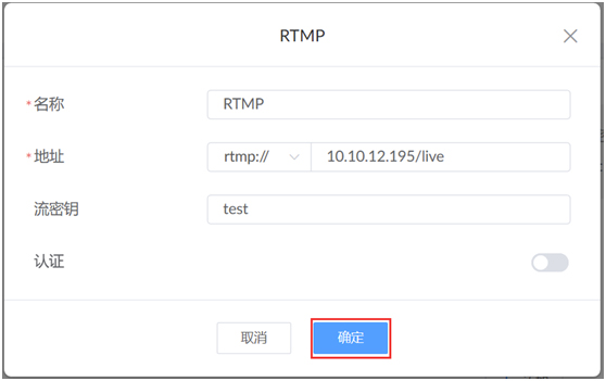 在弹出的页面中填写名称(如图中“RTMP”),地址(如图中的“rtmp://10.10.12.195/live”,10.10.12.195为解码器IP地址)和流密钥(如图中的“test”),点击“确定”。