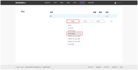 4、同上,登录解码器Web GUI,进入“数据源”页签,在“预设”栏,点击“添加”,选择“RTMP推流”。