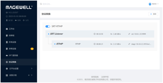 5、通过上述步骤,基于Magewell Cloud协议转换功能,可实现SRT流转RTMP流。