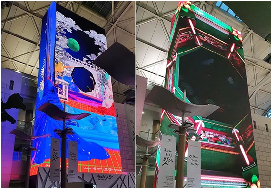 在韩国,仁川国际机场令人惊叹的多媒体中心在2018年底安装时引起了轰动。这座27×10×3.5米的LED区块,总分辨率为4864×6656像素,展示来自国际媒体艺术家的引人注目的短片,并作为吸引注意力的数字标牌,用于传递一系列信息。