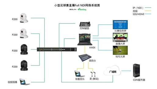 在Full NDI的网络结构里,只需通过网络传输经交换机连通前端云台摄像机(BirdDog EYES P200)、控制键盘(BirdDog PTZ KEYBOARD),接入后端vMIX平台对所有摄像机进行集中管理、预监、切换、加字幕和直播推流等。