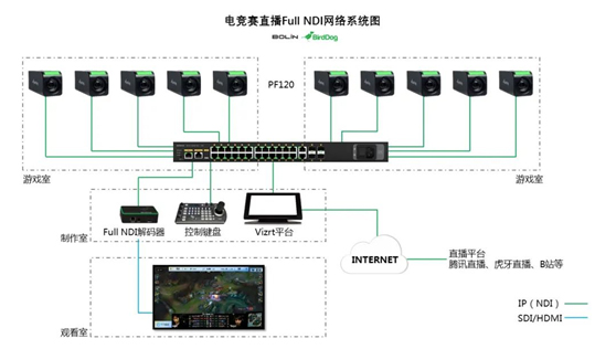 我们在今年3月参与的一场电竞直播中(LDL英雄联盟职业发展联赛春季常规赛),Full NDI枪机(BirdDog PF120)共部署了10个点位,分别拍摄两个游戏室的10位选手。