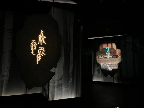位于三层的甲骨数字厅展项由激光投影机呈现的商代生活影片与等比放大的甲骨片相结合。影片将甲骨文字中记载的抽象文字具象表现,通过将甲骨文字转化为现代汉语,再转译为具象化的数字形象语言,帮助观众理解甲骨文中所记载的事件。同时影片呈现载体使用放大的甲骨造型,寓意回归文化本源。