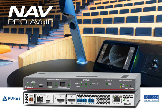 NAV E 222  Extron 全新推出的一款双路输入切换编码器。它为我们屡获殊荣的 NAV® Pro AVoIP 系列平台增添了 USB-C HDMI 输入信号切换功能,让广大 AV 系统设计师能够更加灵活、高效地设计部署高性能的流传输解决方案。